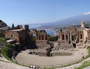 Taormina, fondata dai Nassi intorno al 395 a. C., fu in seguito colonia Romana e munita fortezza medievale.